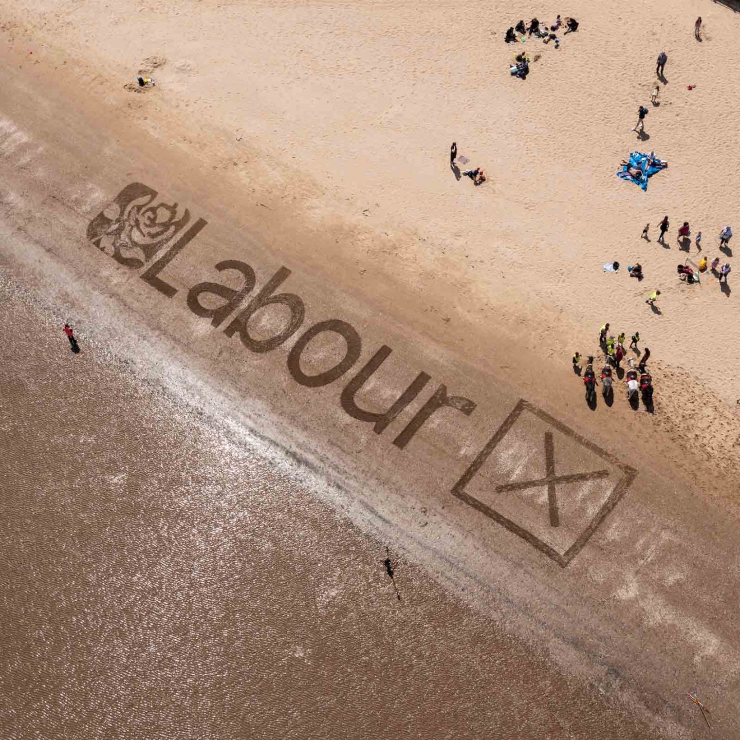 morning of the election results for their broadcast. This involved a quick preparation turnaround and a trip to Cleethorpes bathed in beautiful sunshine. Tide, weather and beach surface all lined up to allow the design to be made at short notice. A very exciting, surprise project! Click here to watch the Sky News coverage.