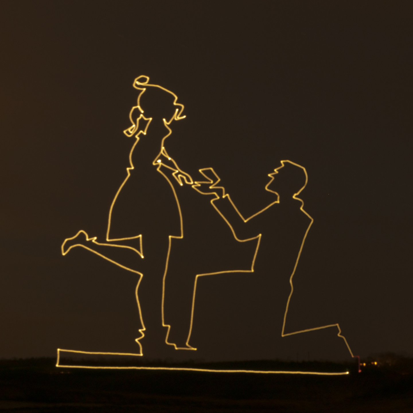 We can show you how to add your own wording to a design, with a torch and freeze that moment in one photographic frame. You can be a part of the design if you wish, standing under it or writing with light. No AI, just a moving light attached to a drone and long exposure to capture your special moment. Many of the images are 90m tall and can create mesmerising reflections when placed over water.